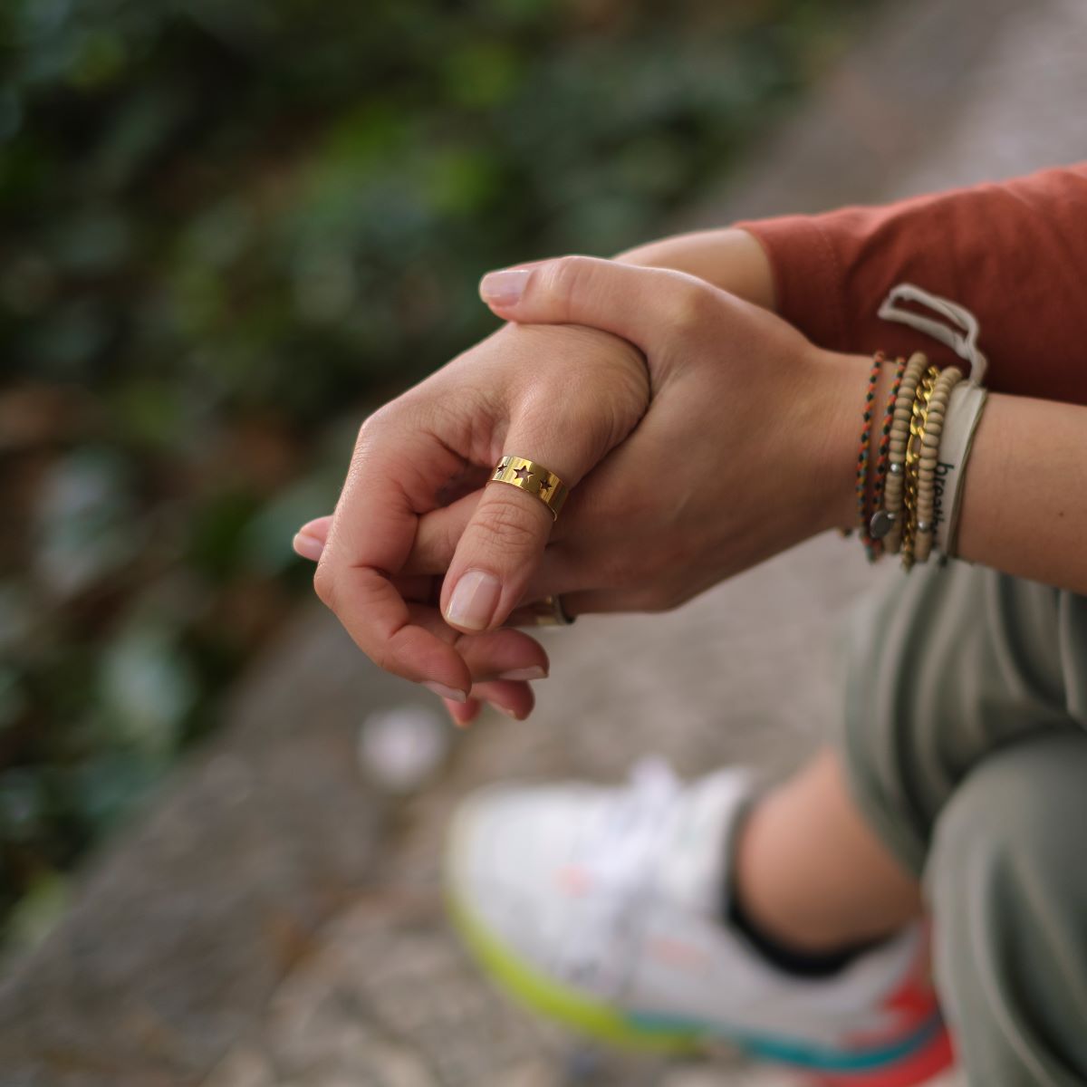 • Mãos femininas entrelaçadas com anel dourado e pulseiras castanhas ao ar livre
