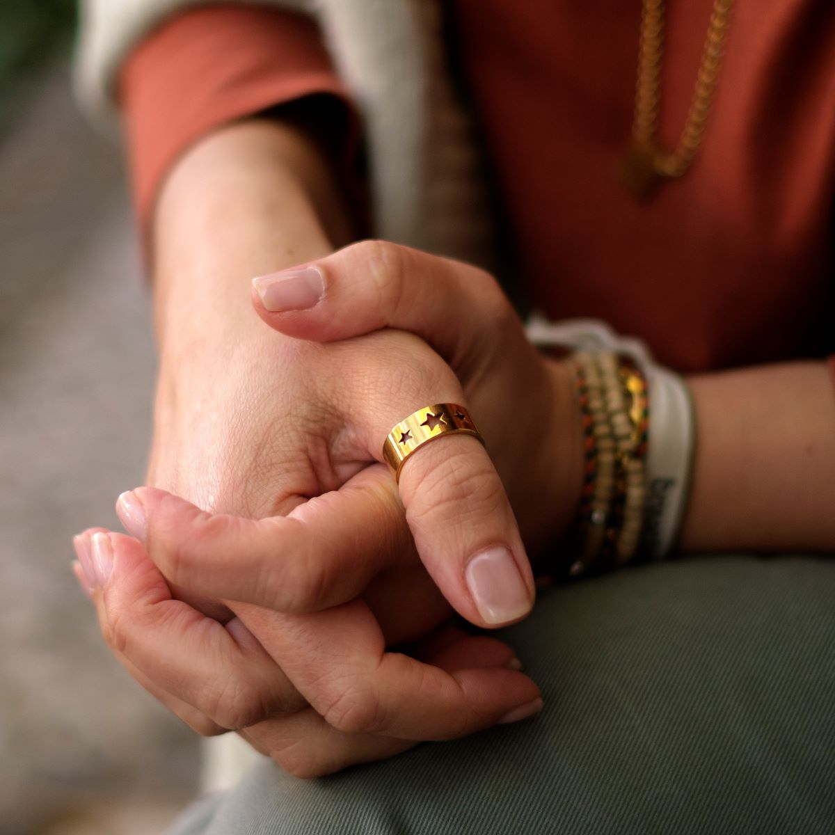 • Anel dourado com estrelas no dedo do meio, mãos cruzadas e pulseiras no pulso