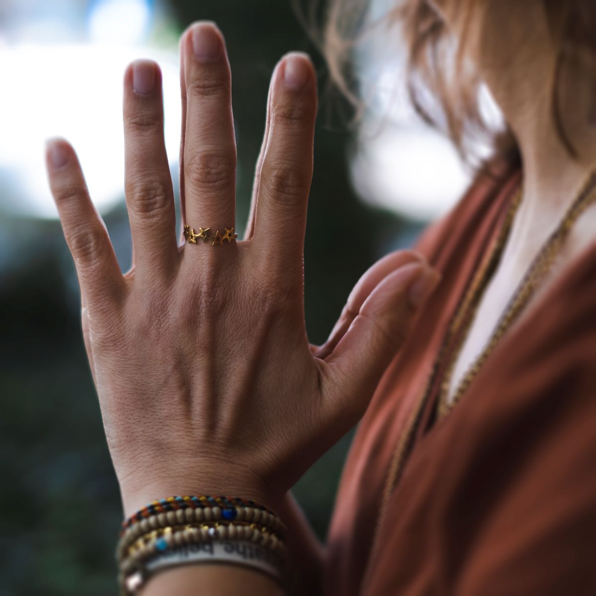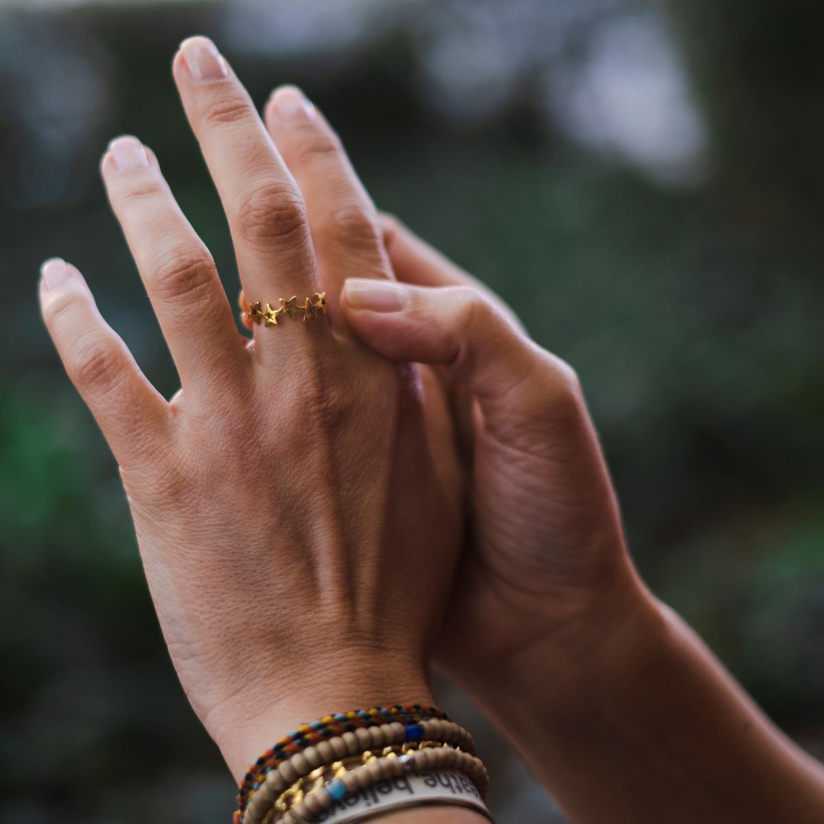 • Mãos femininas com pulseiras e anel dourado decorado com estrelas