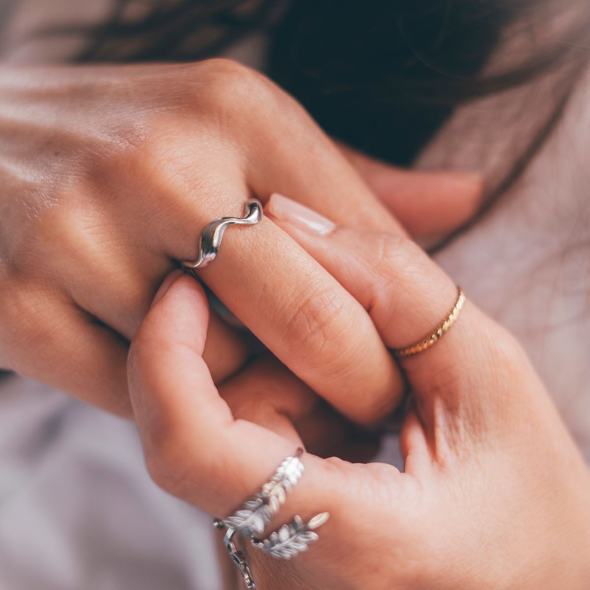 • Mão com anel de prata ondulado e outros anéis decorativos