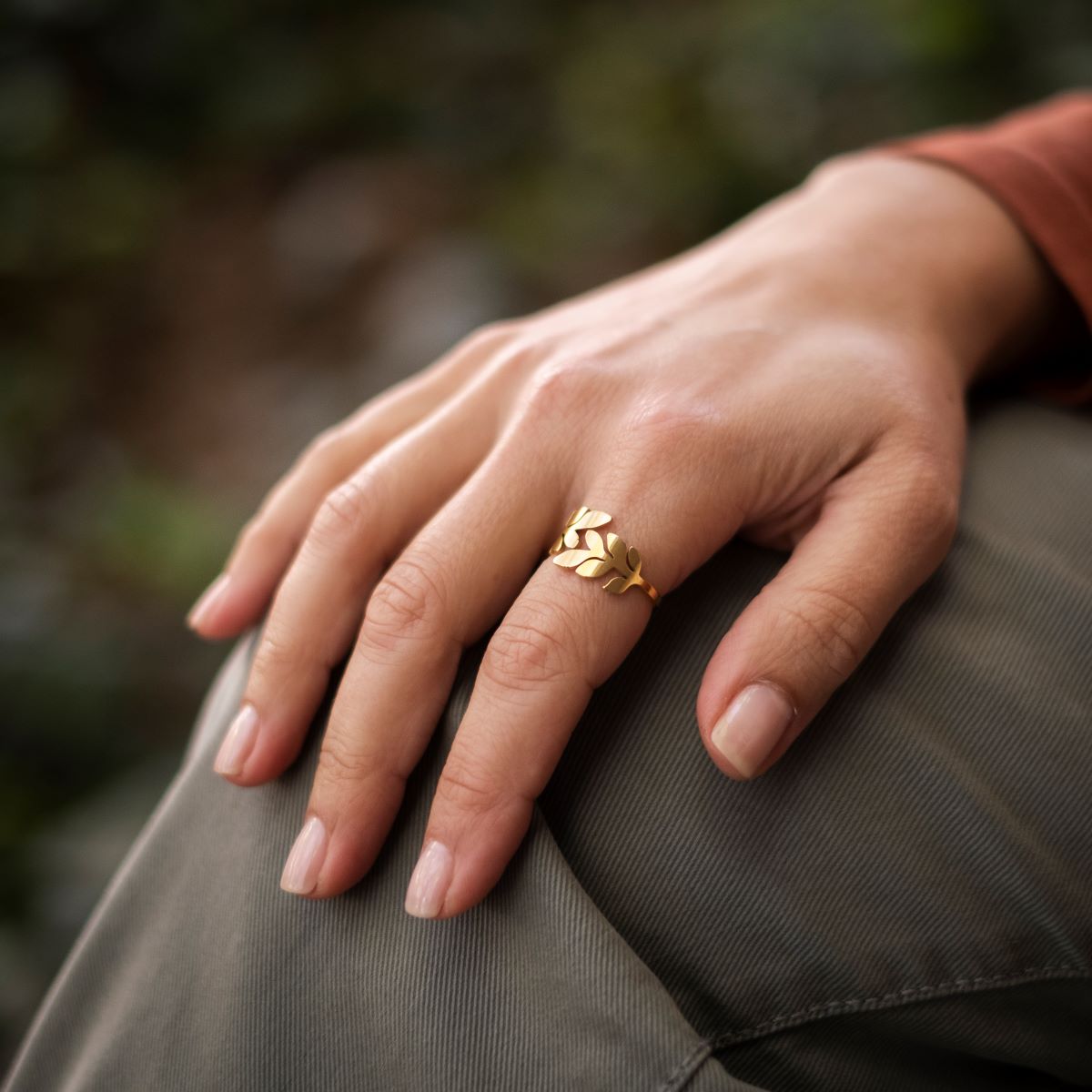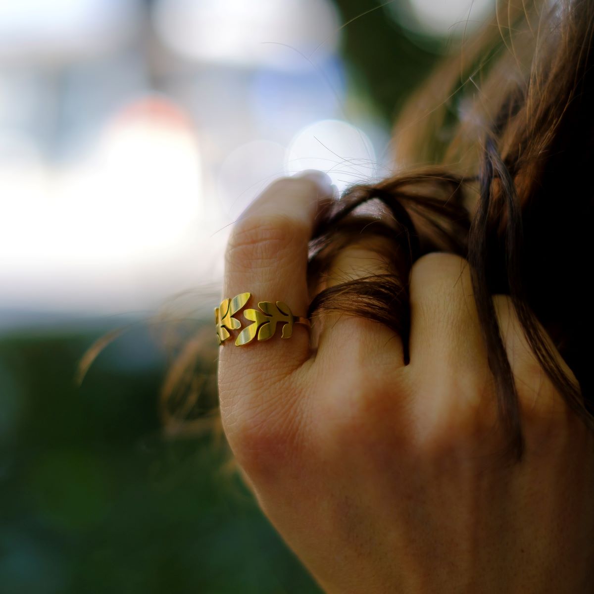 • Anel dourado de folhas no dedo anelar com cabelo castanho ao fundo