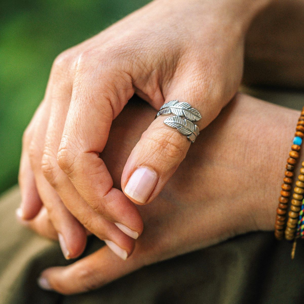 • Anel de prata com design de folhas no dedo médio e pulseiras de contas no pulso