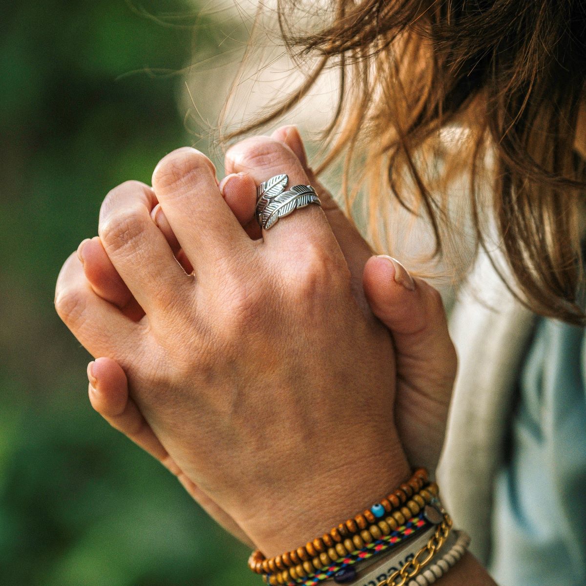 • Mão com anel prateado em forma de penas e pulseiras de contas coloridas num fundo natural