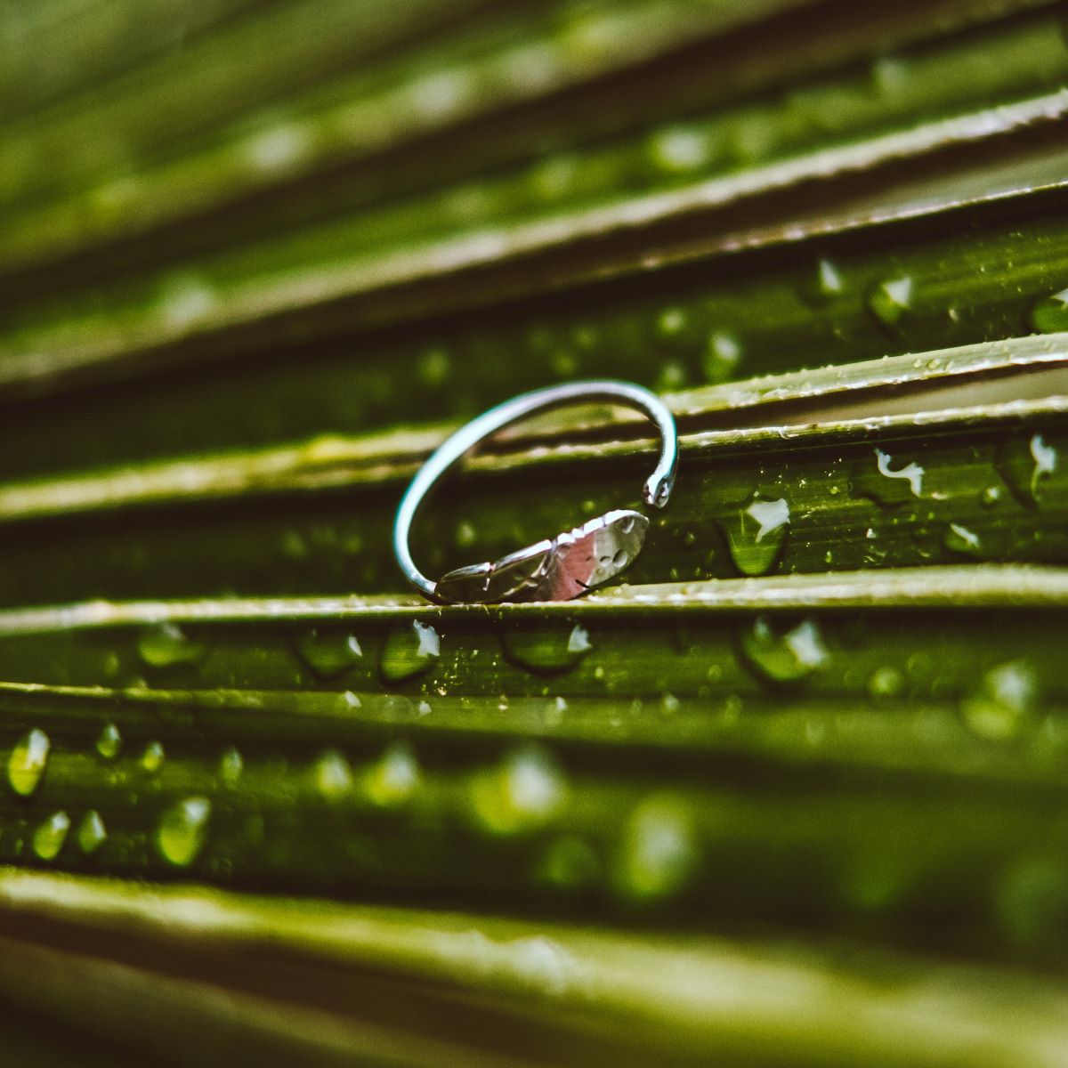 • Anel prateado com pedra oval em folhas verdes molhadas