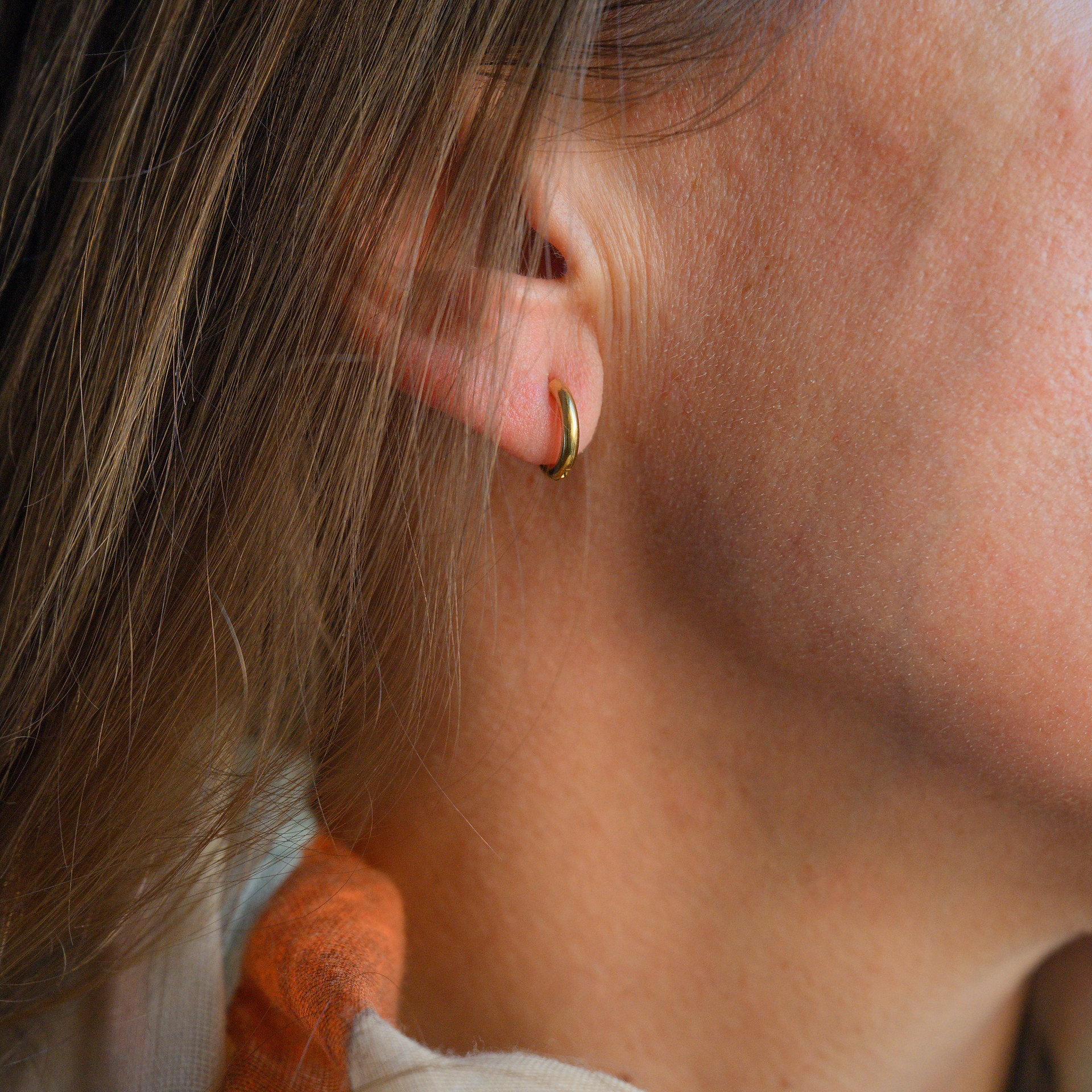 • Argola pequena dourada numa orelha feminina com cabelo castanho claro.