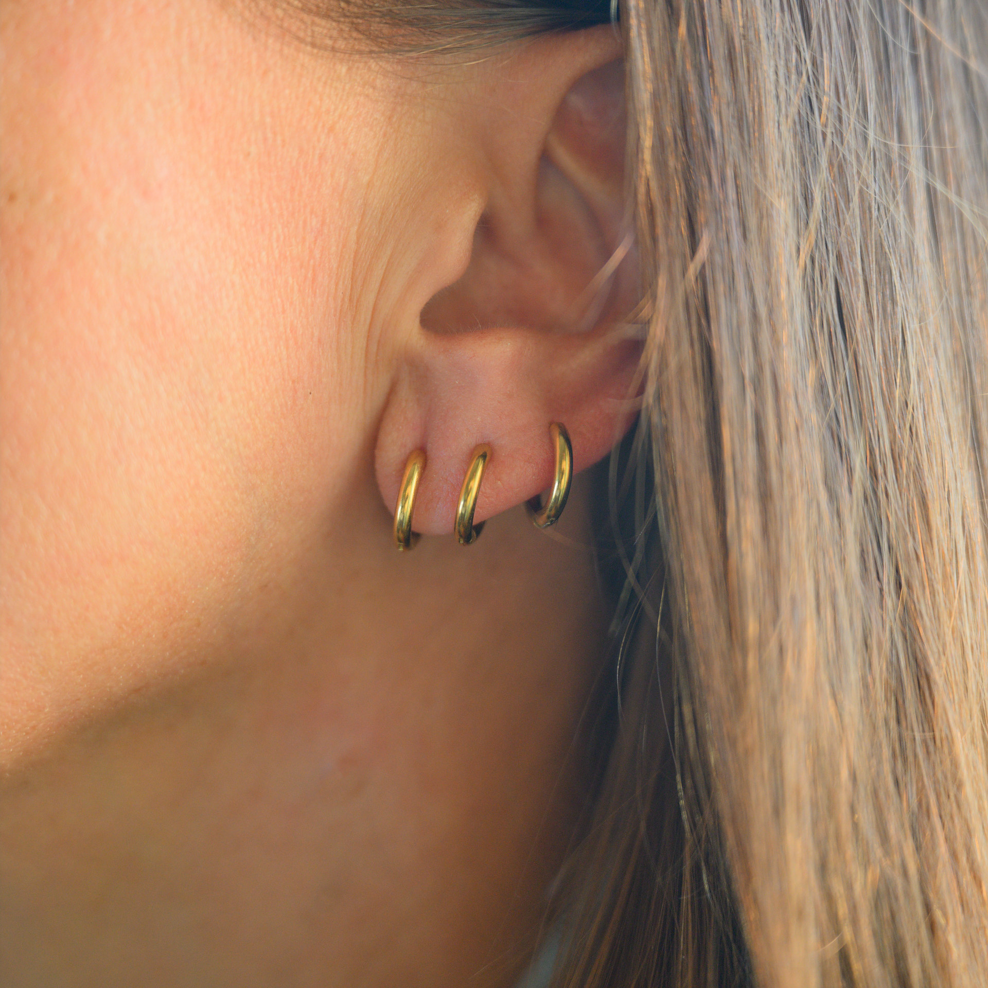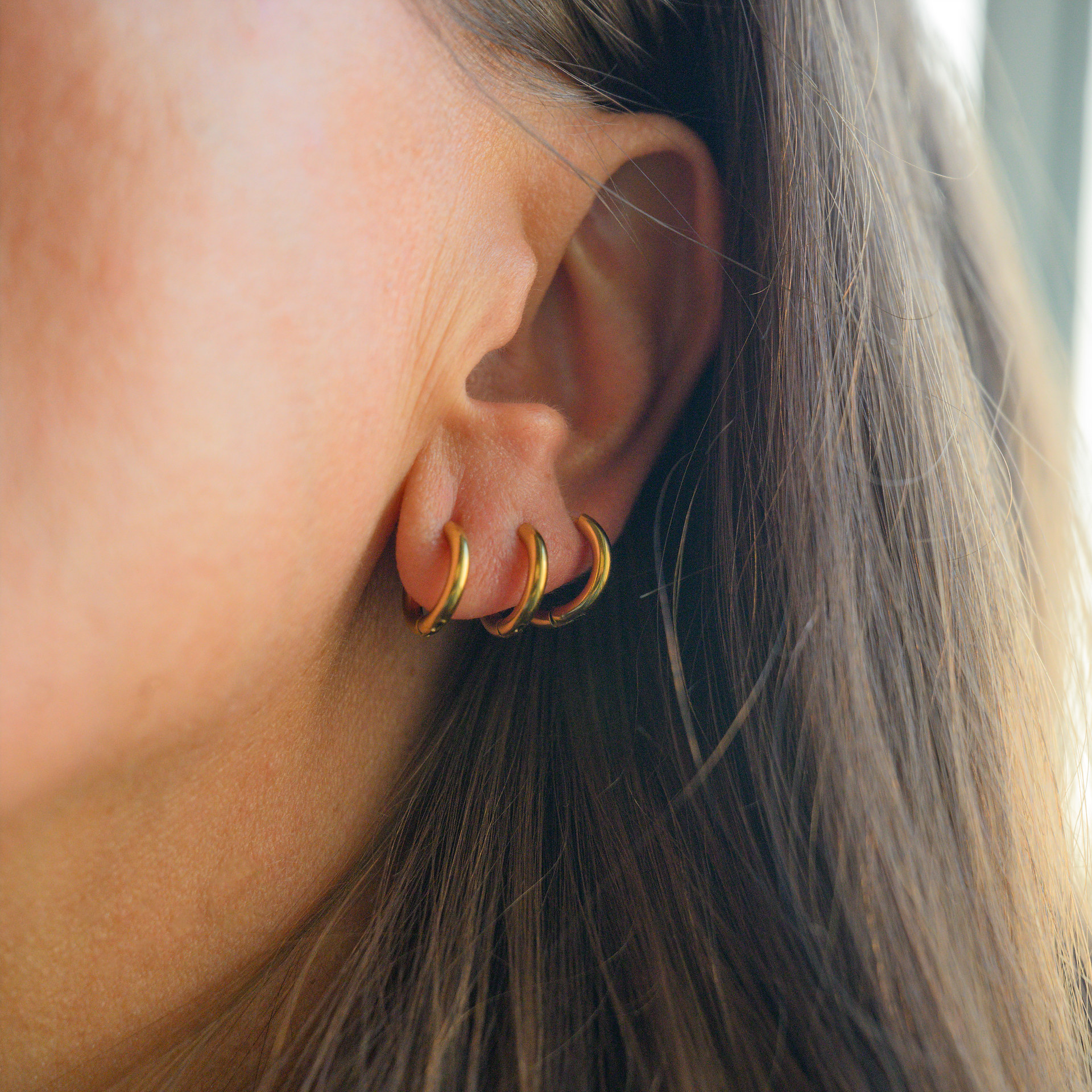 • Três brincos pequenos dourados em argola no lóbulo da orelha