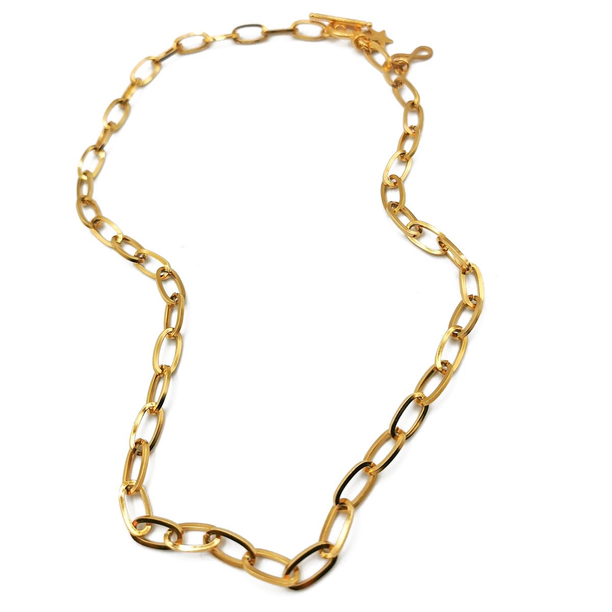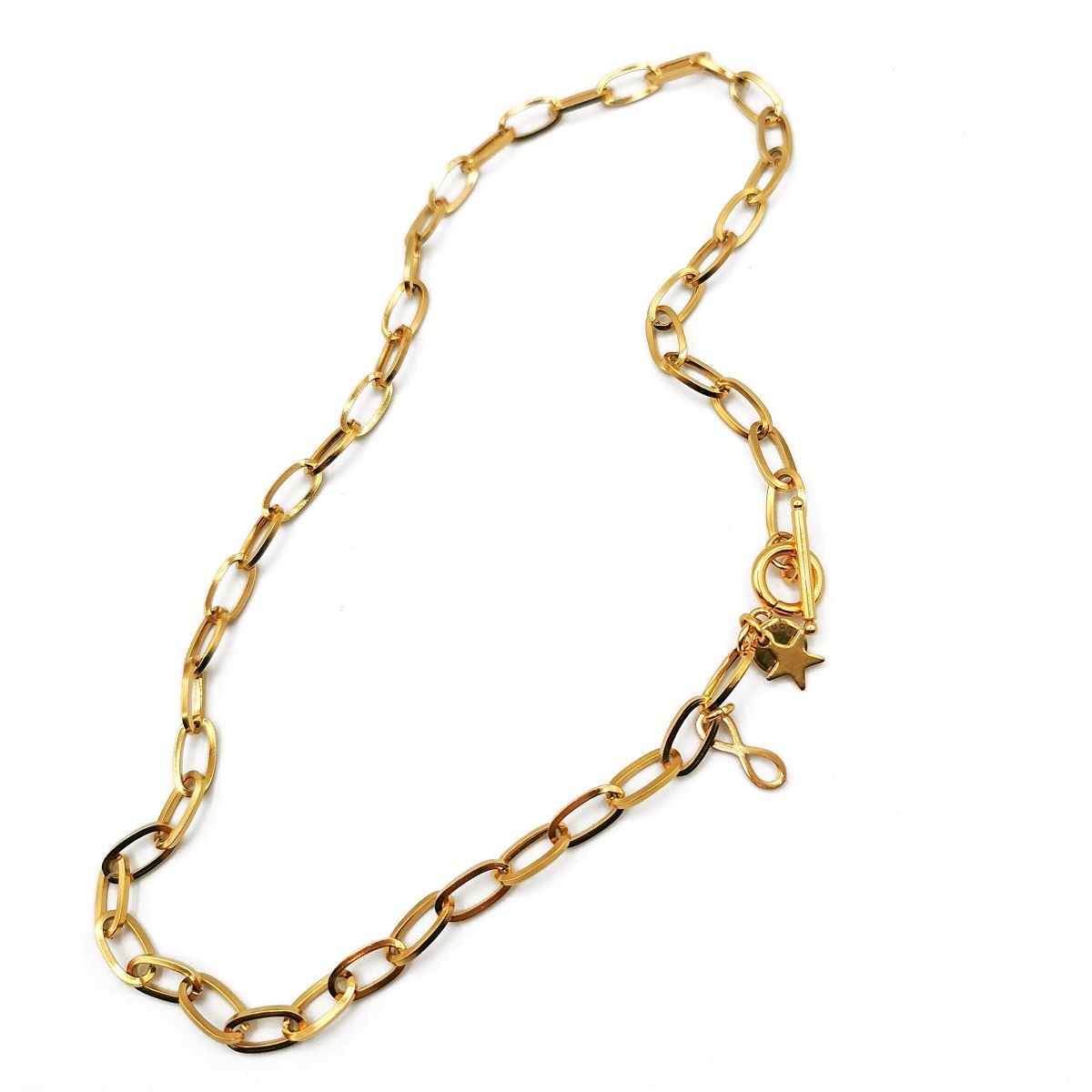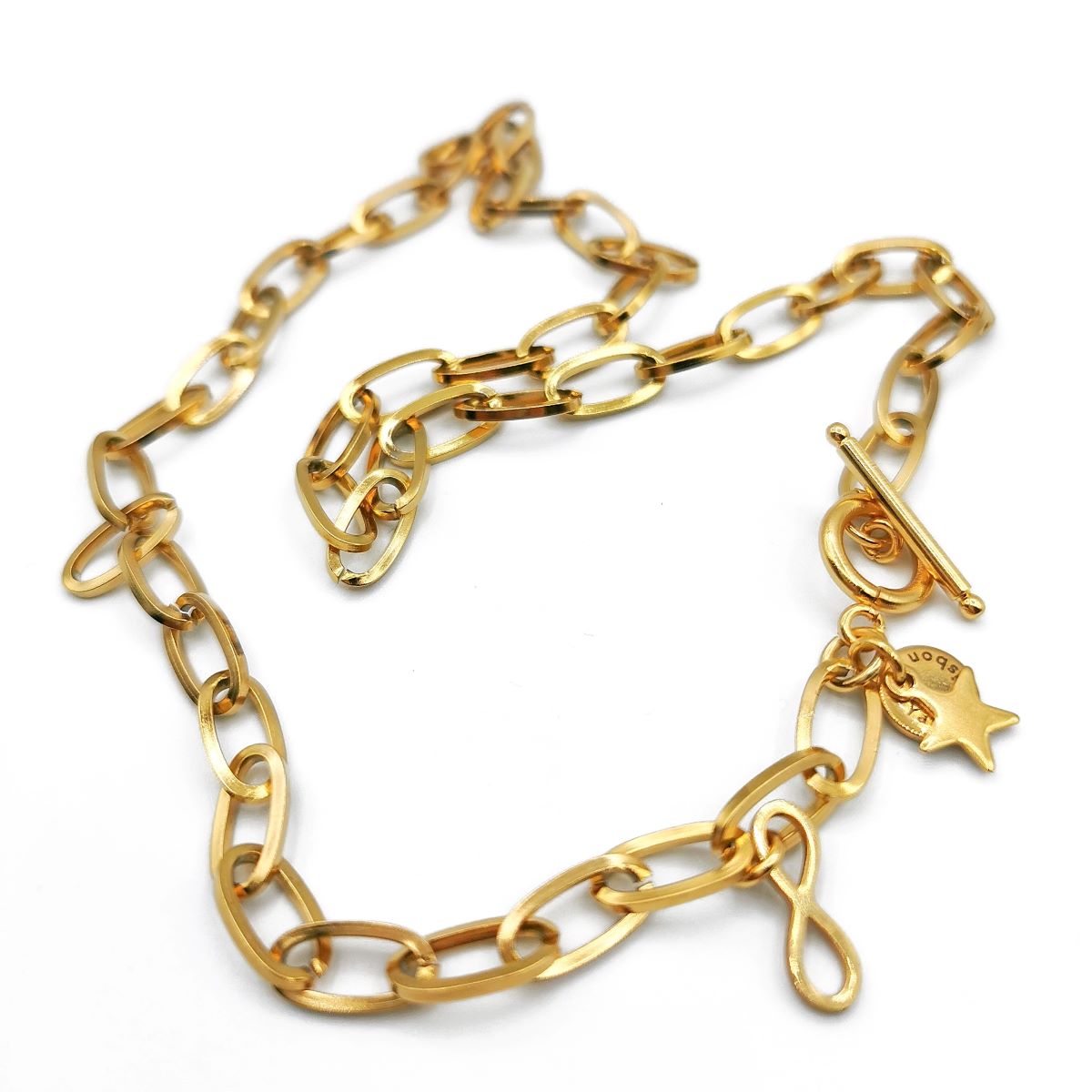 Colar Corrente Dourada 20,00 € Desconto de %. IVA incluído. Partilhar O produto encontra-se sem stock. - Colar corrente em aço dourado com estrela e infinito no fecho. Comprimento aprox. 46,5 cm . *Para mais informações, opções ou personalização fale connosco através do Instagram na nossa página @yasmin.lisbon* Marca Yasmin.Lisbon Características
