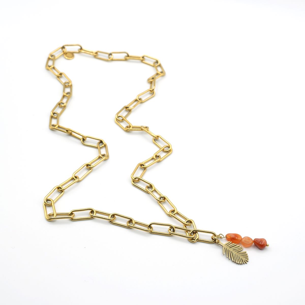 Corrente Folha & Cornalina 24,00 € Desconto de %. IVA incluído. Partilhar Comprar Contactar - Colar corrente em aço dourado com folha e 3 cristais cornalina. Comprimento aprox. 65 cm + pendentes 3 cm . *Para mais informações, opções ou personalização fale connosco através do Instagram na nossa página @yasmin.lisbon* Marca Yasmin.Lisbon Características