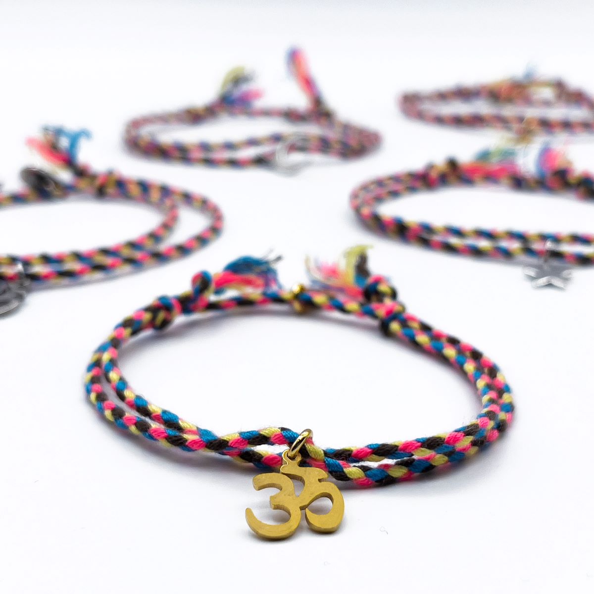 • Pulseiras trançadas coloridas com pendentes metálicos
