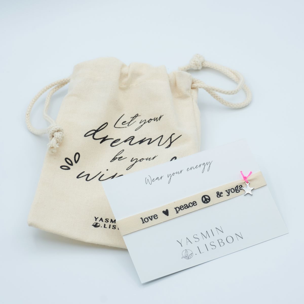 Pulseira Mantra Love. Peace. & Yoga *pendente estrela (+ Bolsa Mantra)