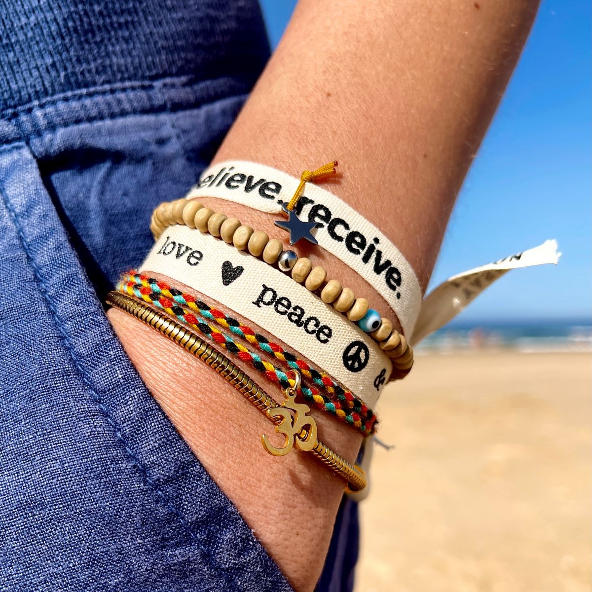 Pulseira Mantra "Love. Peace. & Yoga" em fita de algodão de 1 cm de largura com uma estrela de aço.