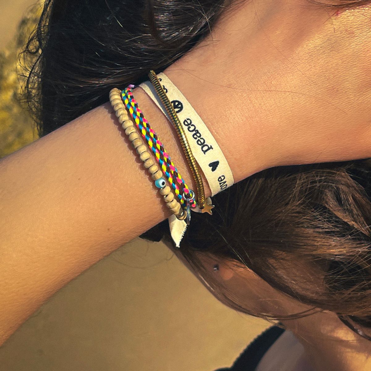 • Pulseiras variadas no pulso de uma pessoa com texto 'I love peace'