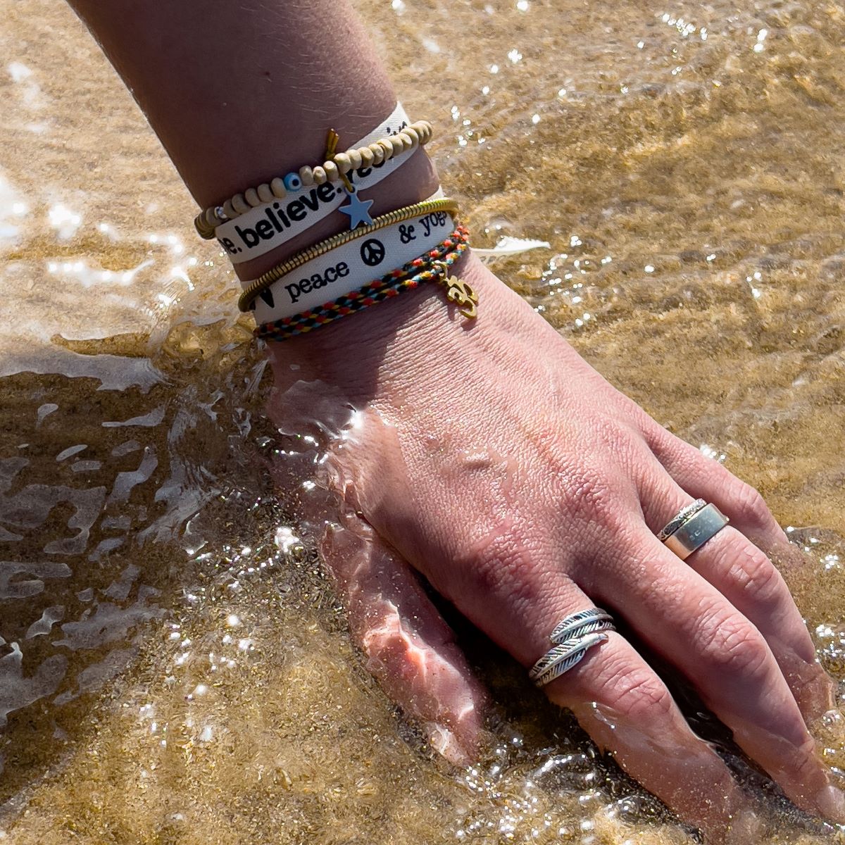 • pulseiras coloridas e com texto no pulso com fundo de praia e céu azul