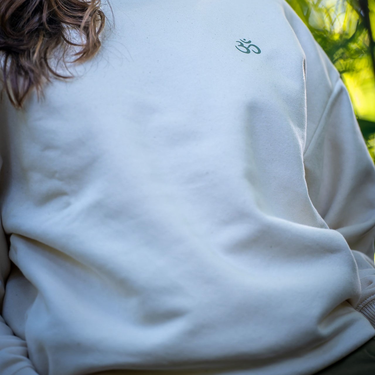 • Sweatshirt branca com símbolo verde Om ao peito em ambiente exterior